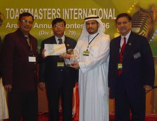 The trainer Sadiq Al Hajji achieved the first place at the international speech contest within the first level (Club Level) and the second level (Area Level) which qualified him to participate at the contest of the third level (Division Level) which is at the level of the east region in the Sudi Arabian kingdom and which was held on 23- 24/3/2006 at Al Meiredian in Al Khabar city by the existence of the American consul as an honor guest and some major guests of the international speakers. The audience number were more than 600 persons.